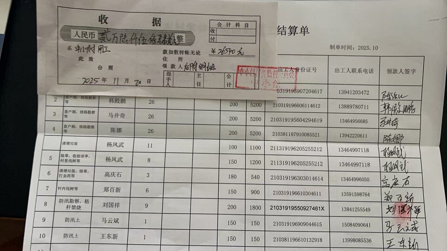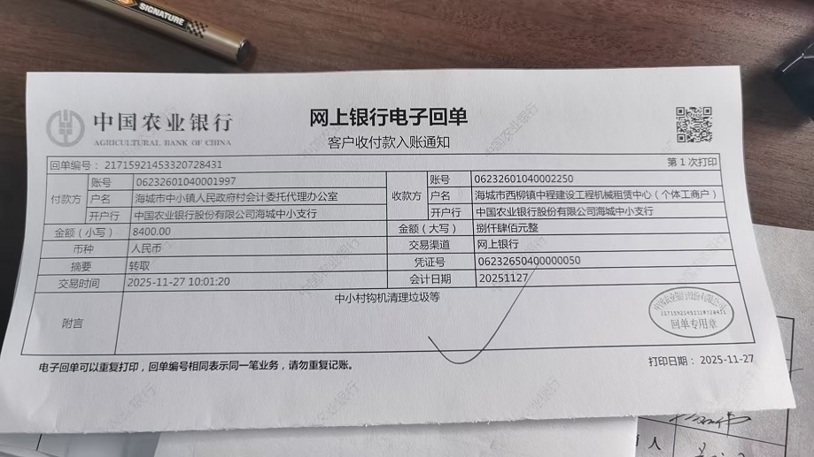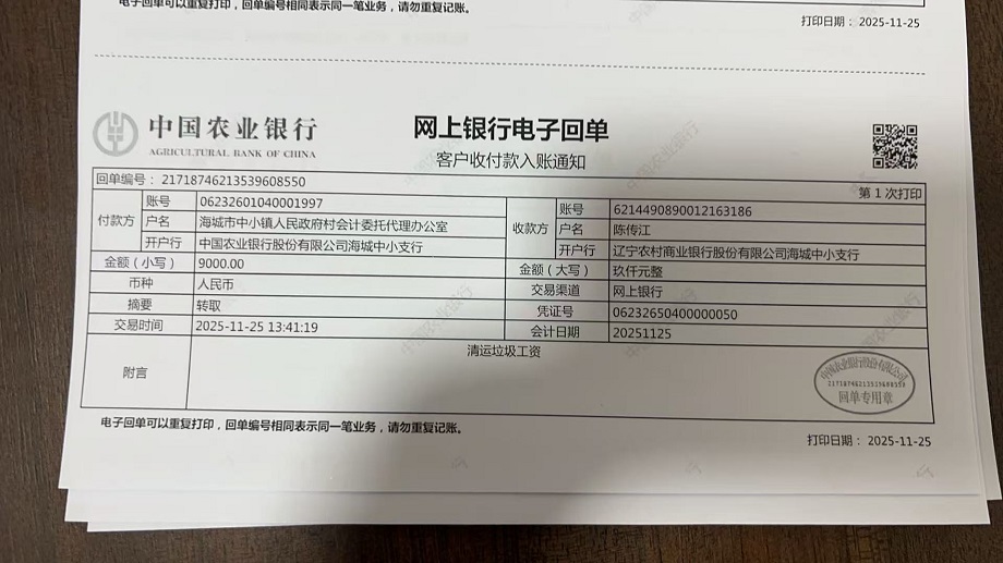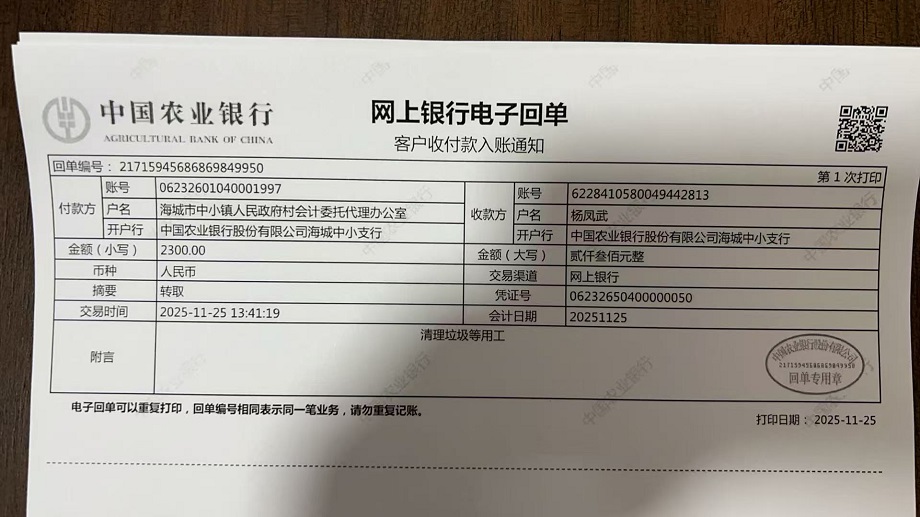 | 2025年11月25日 | 转付清理垃圾等用工 | 2, 300.00 | -90, 863.54 | 点击查看 | |