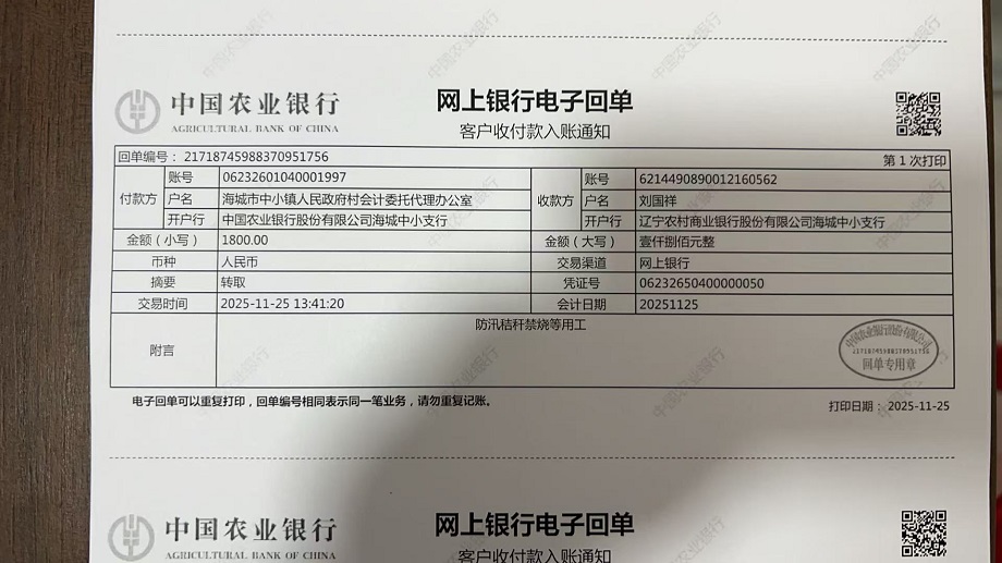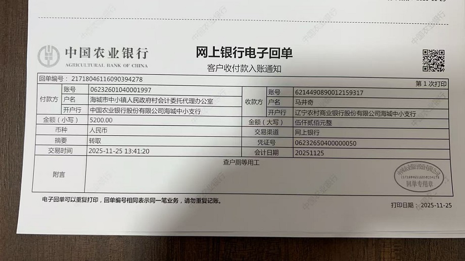 | 2025年11月25日 | 转付马井奇秸秆禁烧等用工 | 5, 200.00 | -68, 954.17 | 点击查看 | |