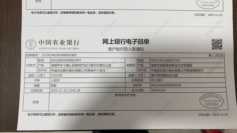 | 2025年11月25日 | 转付消防车电池款 | 1, 100.00 | -8, 362.67 | 点击查看 | |
