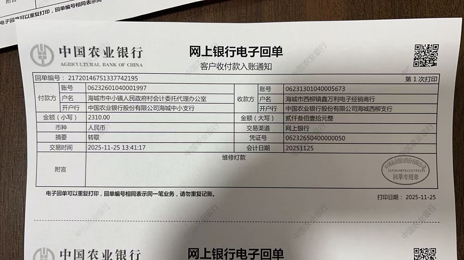 | 2025年11月25日 | 转付村委会维修灯款 | 2, 310.00 | -62, 040.17 | 点击查看 | |