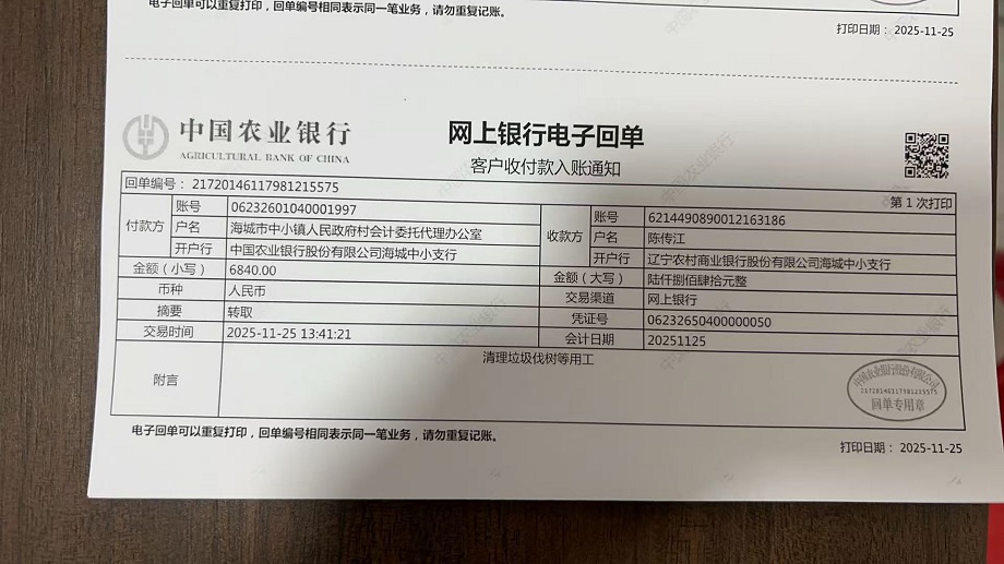 | 2025年11月25日 | 转付陈传江用工款 | 6, 840.00 | -50, 000.17 | 点击查看 | |