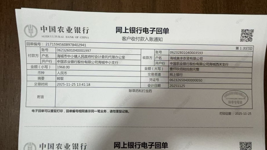 | 2025年11月25日 | 转付除草药打虫药款 | 1, 968.00 | -46, 587.67 | 点击查看 | |